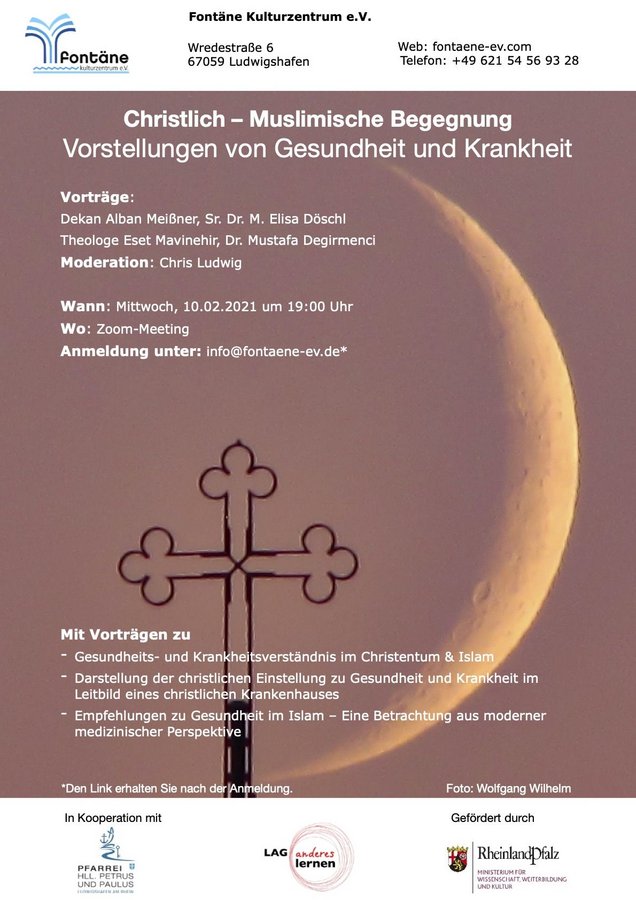 Die nächste "Christlich-Muslimische Begegnung" findet am 10. Februar um 19 Uhr statt und wird in Kooperation mit der Pfarrei Heilige Petrus und Paulus durchgeführt. Moderator Chris Ludwig führt durch den Abend, der unter dem Thema "Vorstellungen von Gesundheit und Krankheit" steht.