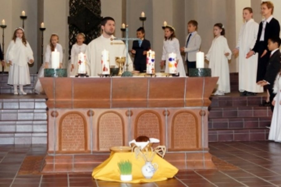 An den Sonntagen nach Ostern feiern Jungen und Mädchen in den katholischen Pfarreien ihre Erstkommunion. Die Vorbereitung ist beendet, nun freuen sie sich auf ihr großes Fest. In der Pfarrei Hll. Petrus und Paulus ist der Festgottesdienst zur Erstkommunion überschrieben mit dem Motto: "Die Freundschaft Jesu ist ein Schatz."