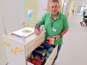Schlusser ist 65 Jahre alt, ausgebildeter Krankenpfleger und freiberuflicher Künstler. Sein Kunststudium finanzierte er selbst, arbeitete nachts in der Pflege, tagsüber künstlerisch. Schon früh beschäftigte ihn das Thema Tod. Heute ist er mit 14 Stunden im Monat auf der Palliativstation tätig – seine Stelle wird vom Förderverein Hospiz und Palliativ für Ludwigshafen und den Rhein-Pfalz-Kreis finanziert. Die Begegnungen mit den Patient*innen bedeuten ihm viel. „Sie sagen oft, ich sei der Gute-Laune-Onkel. Mir macht die Arbeit große Freude und ich habe das Gefühl, ich gebe den Menschen etwas“.