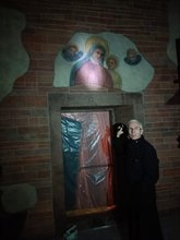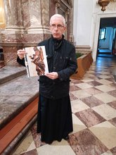 Pater Wojciech Kordas zeigt ein Bild der verbrannten Schwarzen Madonna