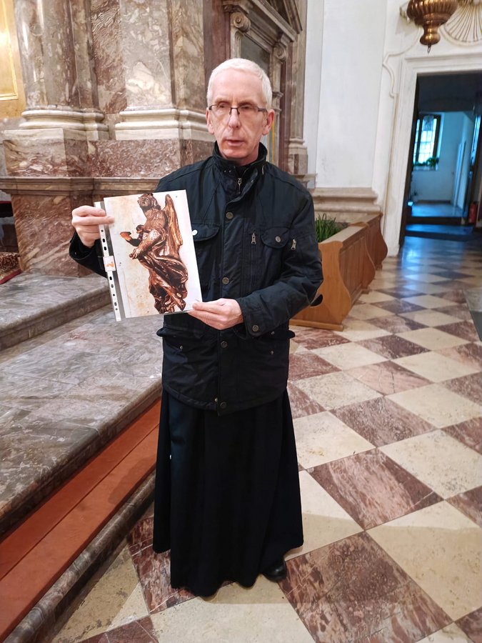 Im Schein einer Taschenlampe zeigt er die renovierten Wände mit den Fresken. Die Farben leuchten, es ist keine Spur von Ruß zu entdecken. Das sah nach dem Brand am 28. September 2022 ganz anders aus, wie Pater Wojciech anhand zahlreicher Bilder erläutert. Die Schwarze Madonna war vollkommen mit Ruß überzogen, von ihrem Mantel war nur noch ein kleines Häuflein verkohlter Stoff übrig. Auch die beiden Engel von Paul Egell, die links und rechts der Madonna standen, haben unter den Flammen gelitten, ebenso der Altar. Und nicht nur Wände, Fresken und Decken der Kapelle waren vollkommen verrußt, sondern der gesamte Innenraum der Wallfahrtskirche. Bis heute seien die Brandstifter nicht gefasst, berichtet Pater Wojciech, der das Feuer seinerzeit entdeckte, beherzt zum Feuerlöscher griff und mit einer Rauchgasvergiftung im Krankenhaus behandelt werden musste.