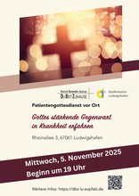 Herzliche Einladung an kranke Menschen und ihre Angehörigen zum nächsten Patientengottesdienst am Mittwoch, 5. November 2025, um 19 Uhr im Dietrich-Bonhoeffer-Zentrum in der Rheinallee 3 in Ludwigshafen statt.