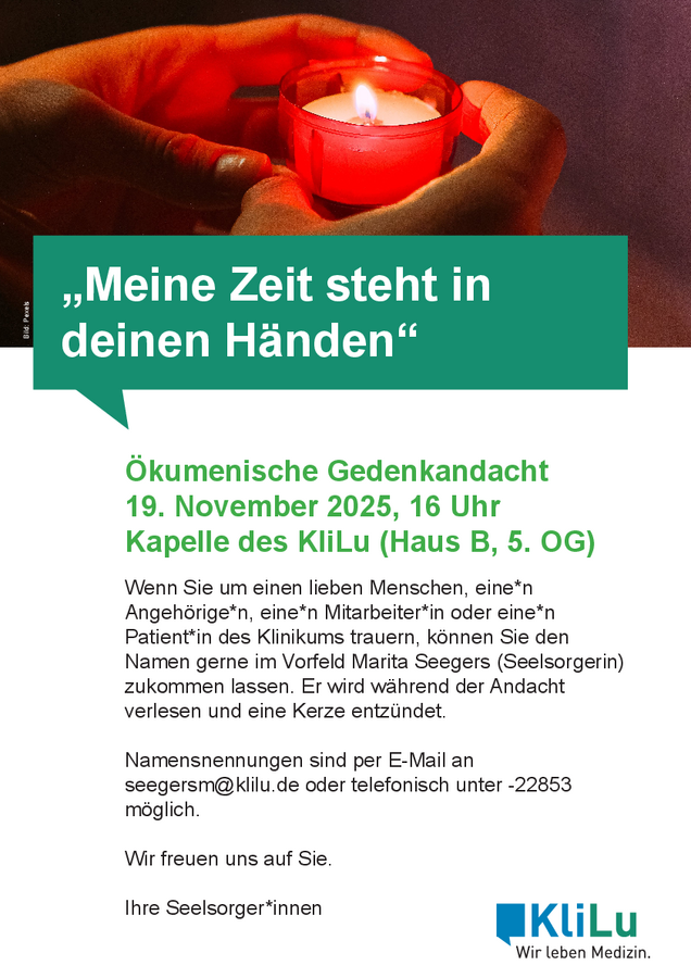 Am 19.11.2025 (Buß- und Bettag) findet um 16.00 Uhr in der Kapelle des Klinikums der Stadt Ludwigshafen (Haus B, 5. Stock) eine Gedenkandacht für alle seit November 2024 im Haus verstorbenen Patientinnen und Patienten, Mitarbeiterinnen und Mitarbeiter statt. In der Andacht werden die Namen der Verstorbenen – soweit bekannt – verlesen und für jeden eine Kerze angezündet.