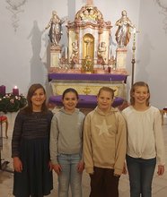 Bildunterschrift: Die vier Sternsinger aus Ludwigshafen Amelie Brandl, Isabella Czaban, Greta Wendel und Nela Gutermann (v.l.n.r.) © Birgit Bastian