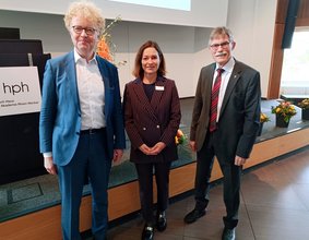 Prof. Christian Lob-Hüdepohl und Pfarrerin Jung und Domkapitular Hundemer. Jung und Hundemer sind im Vorstandsmitglieder der Ökumenischen Hospizhilfe Pfalz/Saarpfalz.