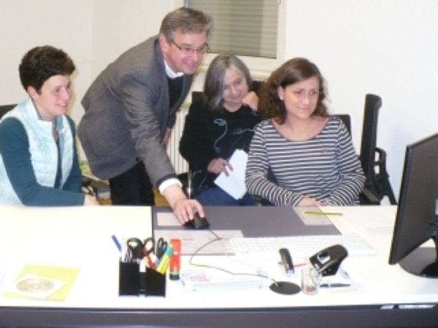Bild: Homepagestart im Pfarrbüro Heilige Edith Stein: Der Kreis der engagierten Autorinnen mit Pfarrer, von links: Anja Schulte, Christian Eiswirth, Andrea Sattler-Klein und Isabelle Herrmann.