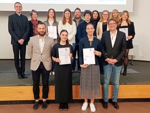 Die Träger*innen des Religionspreises 2025 mit ihren Lehrer*innen und Dekan Dominik Geiger