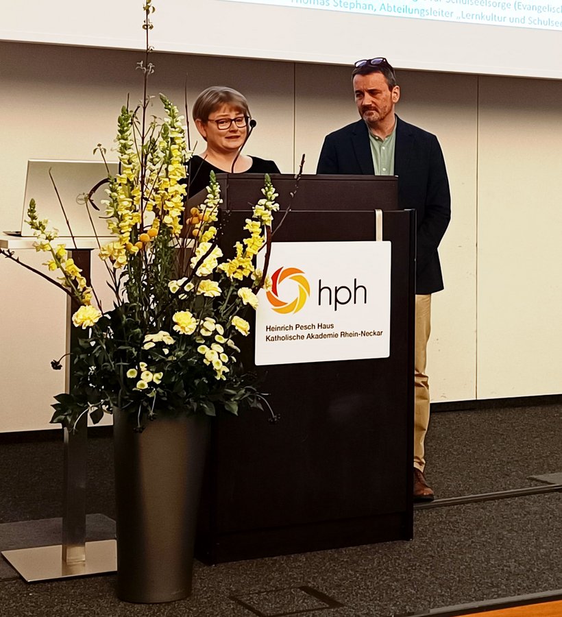 Mit der ökumenischen Schulseelsorge stand beim Festvortrag ein schulnahes Thema auf dem Programm. Pfarrerin Anke Lind, Beauftragte für Schulseelsorge der evangelischen Kirche der Pfalz, und Thomas Stephan, Abteilungsleiter Lernkultur und Schulseelsorge im Bistum Speyer, gaben zunächst einen Überblick über die vielfältigen Aufgaben der Schulseelsorge. Zu diesen gehören etwa Segensfeiern für Abiturient*innen, Räume der Stille an Schulen und natürlich ein offenes Ohr für die Schüler*innen. „Schulseelosrge will Wegbegleiterin sein“, sagte Anke Lind.