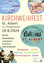 Das Kirchweihfest beginnt um 10 Uhr mit einem Gottesdienst, der musikalisch von "Die Grusicals" gestaltet wird. Daran schließt sich das Fest mit Mittagessen, Kinderprogramm, Hüpfburg, Bühnenprogramm, Kaffee und Kuchen sowie Grillen an.